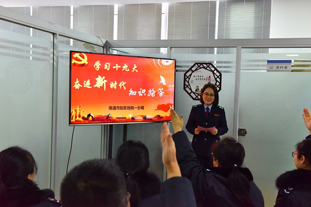 新年来临之际,如东地税一分局组织“学习十九大 奋进新时代”知识抢答活动。通过活动进一步激发同志们学习十九大精神热情,不忘初心、牢记使命,把十九大精神与当前税收工作相结合,在十九大开局年有新气象、新作为。